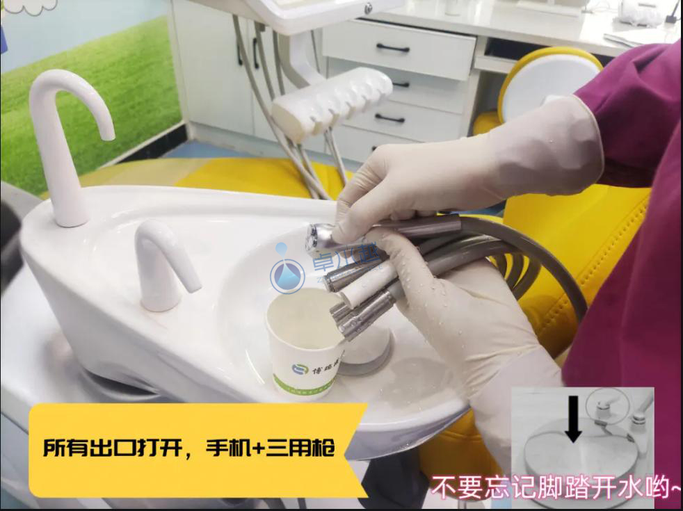 1、每日開診前,對高速、低速、潔牙機、三用槍等水路管道沖洗3分鐘,保證管道的潔凈。